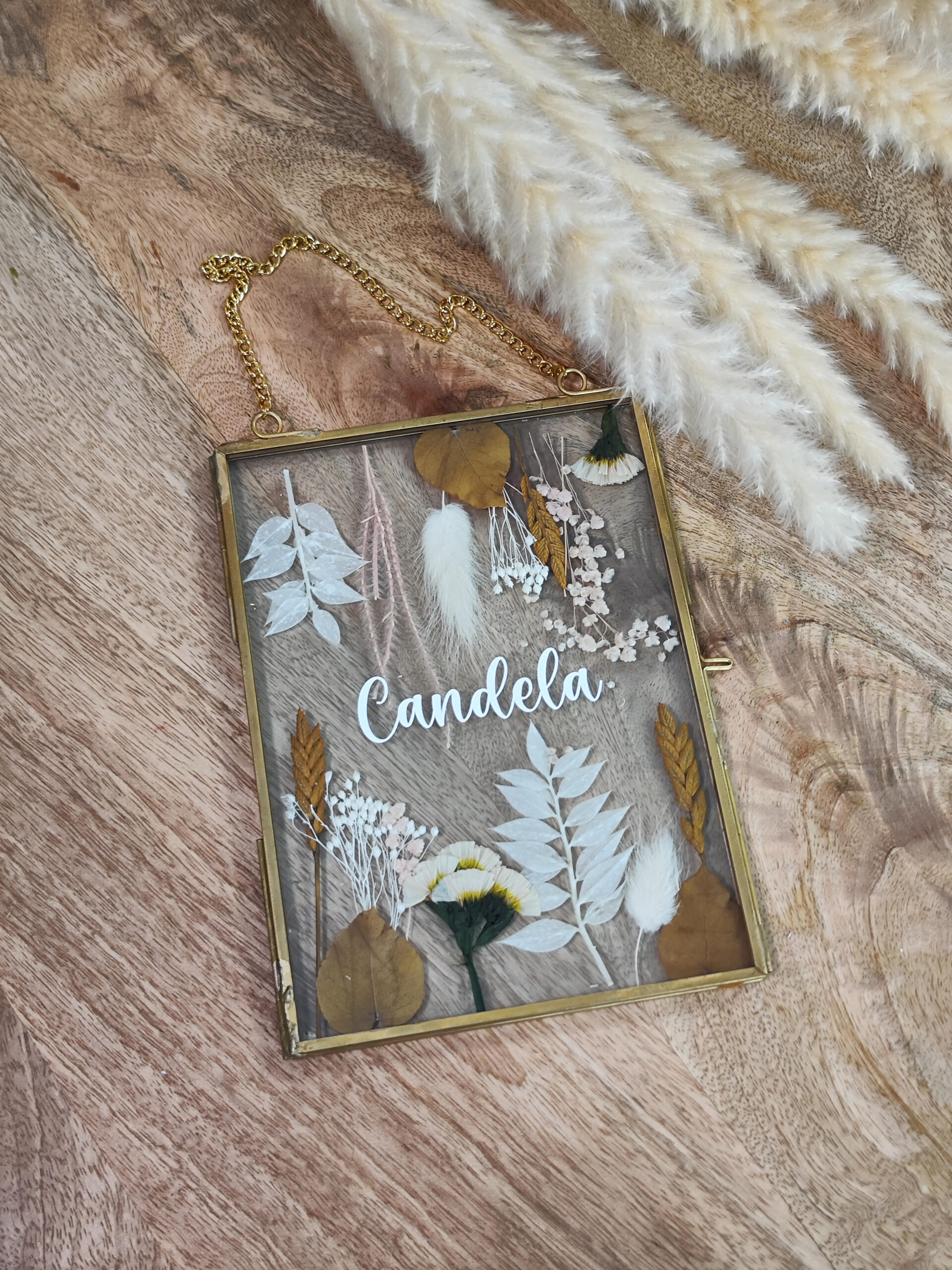 Marco de metal y fondo de cristal que complementa perfectamente con la delicadeza de las flores.