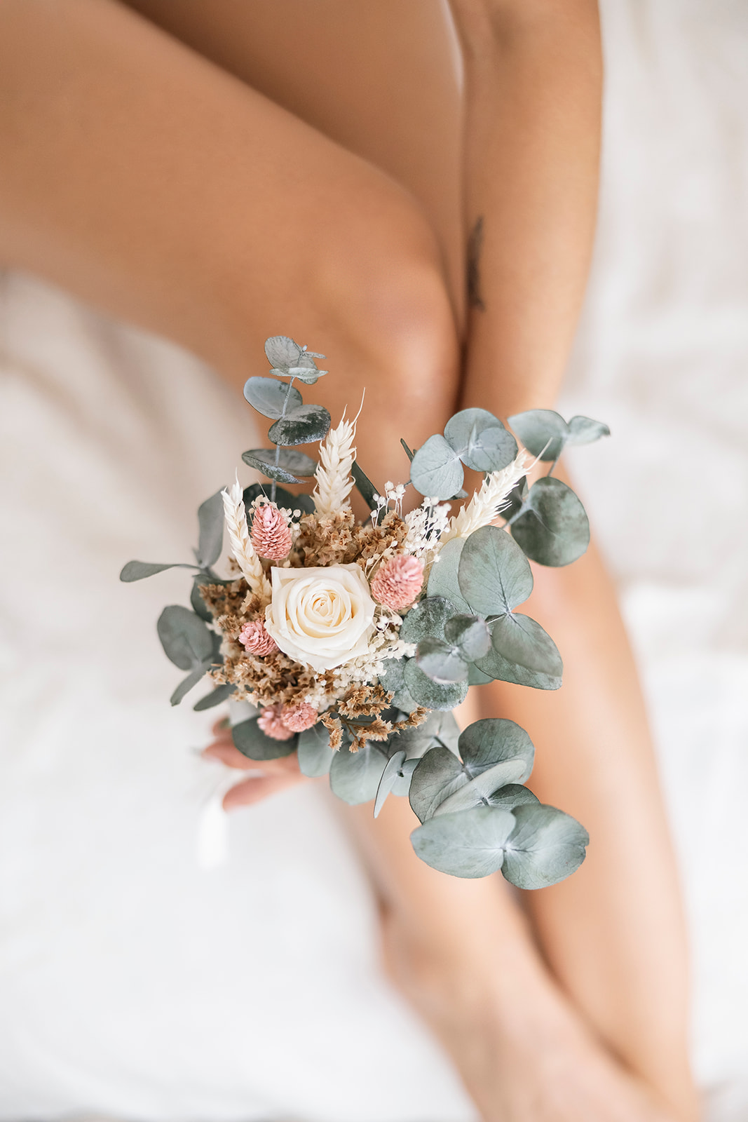 🌹 Una rosa preservada amb un delicat ramillet d’altres flors preservades i seques — símbol etern d’amor. El color de la rosa es pot escollir entre vermell, blanc o rosa.