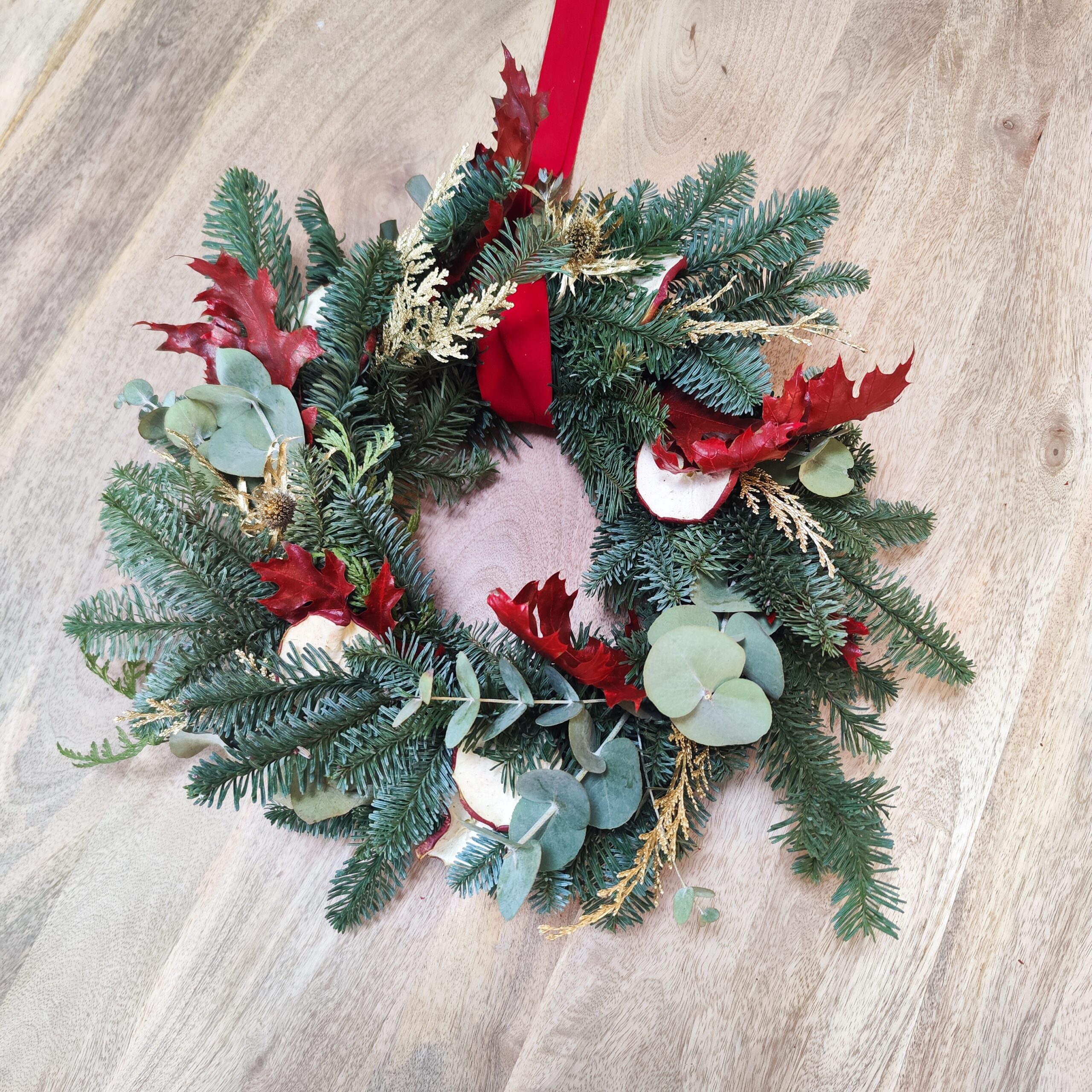 Trabajaremos con nobilis, eucalipto, tuya, algodón, canela, piñas, naranja y manzana deshidratada, entre otros. Combinaremos materiales que evocan el invierno y el espíritu navideño.