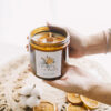 Envase de vidrio ámbar con tapa y decoradas con canela polvo y en rama y naranjas deshidratadas.